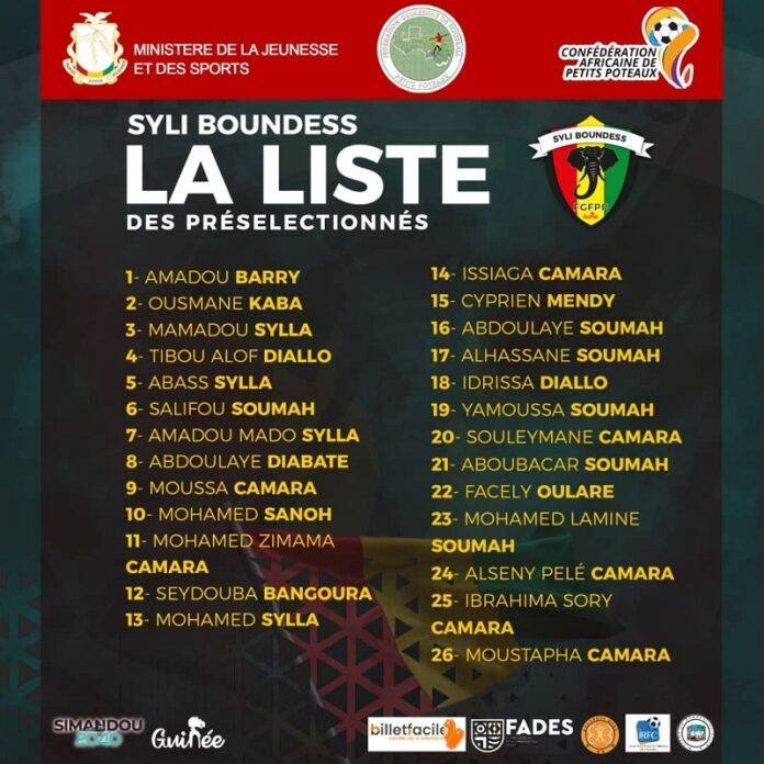 Le sélectionneur du Syli Boundess, Mamadou Yéro Baldé, a dévoilé ce jeudi 3 juillet 2025, la liste des 26 joueurs présélectionnés pour le regroupement de l’équipe nationale à l’orée de la Coupe d’Afrique de Petits Poteaux. Cette compétition est prévue du 15 au 25 août 2025 à Abidjan en Côte d’Ivoire.