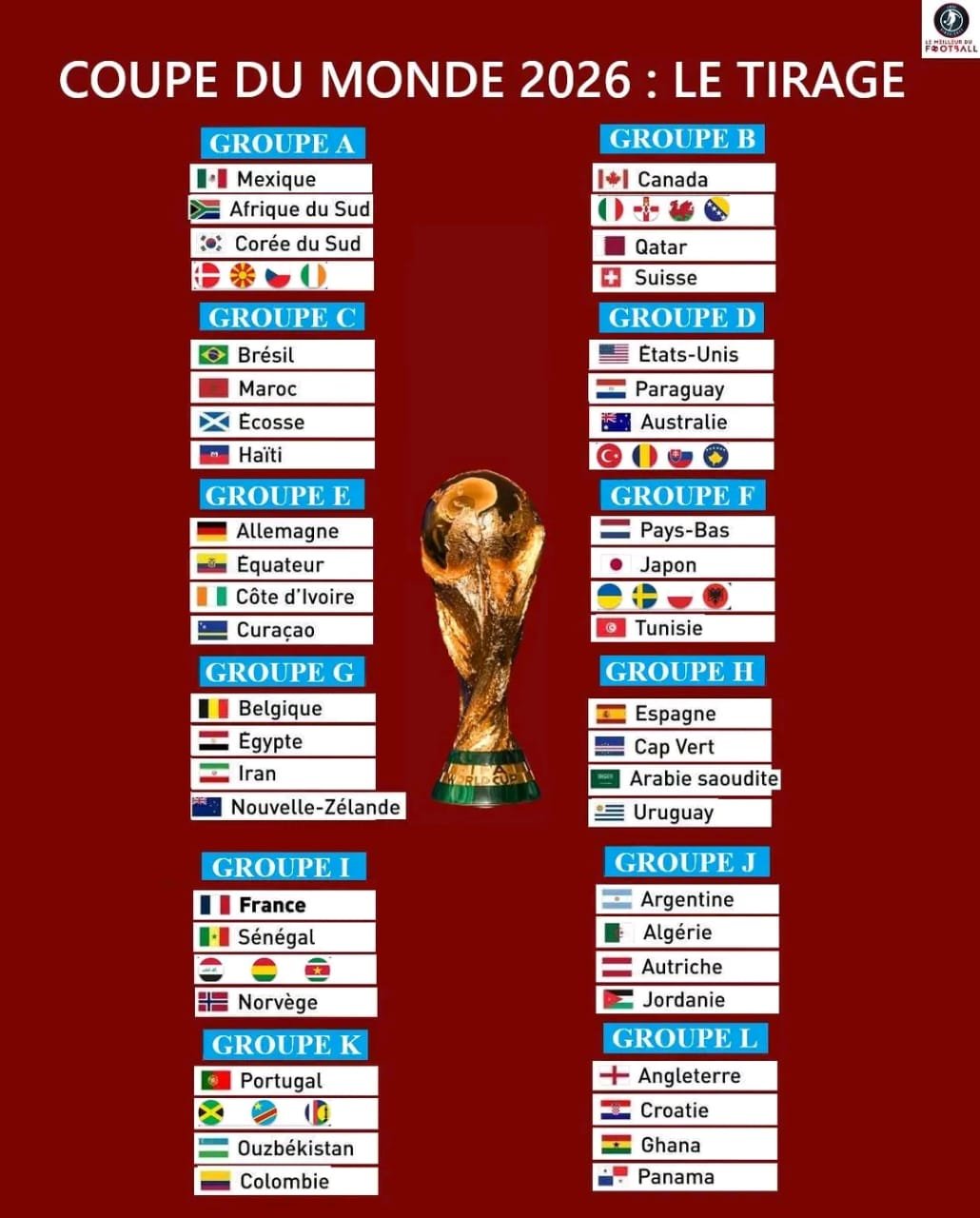 Résultat : des groupes globalement équilibrés, mais aussi quelques configurations explosives. Dans le Groupe C, on retrouve par exemple le Brésil et le Maroc ou encore l’Allemagne et la Côte d’Ivoire dans la poule E. Dans le Groupe I, la France se retrouve avec le Sénégal, tandis que l’Angleterre, la Croatie, le Ghana se croisent dans le groupe L.